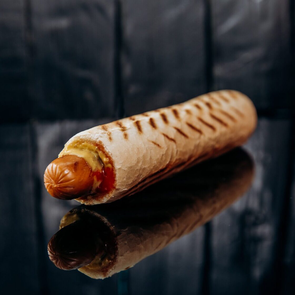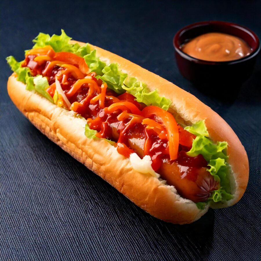 Склад: сосиска, томат, огірок, лист салату, морква, фірмовий соус, кетчуп.