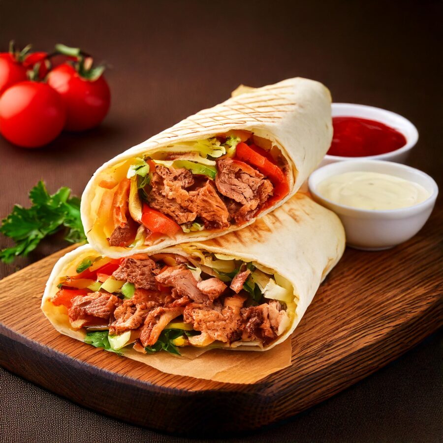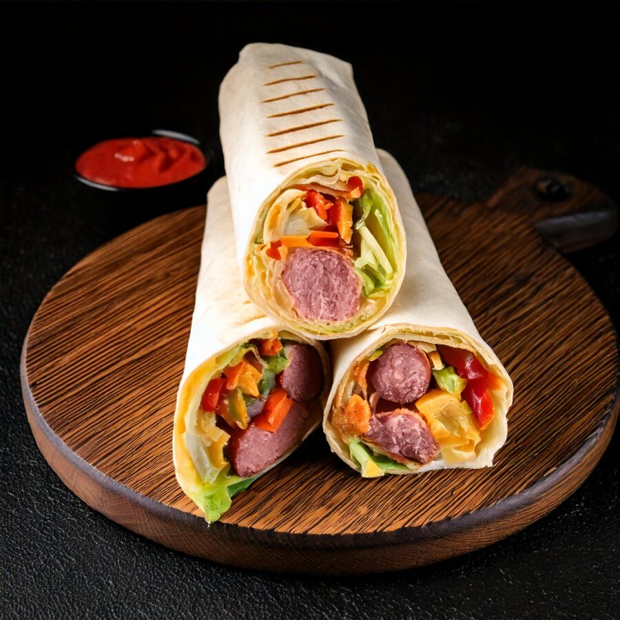 Склад: сосиска, картопля фрі, морква, огірок, сир, гриби, фірмовий соус, кетчуп.